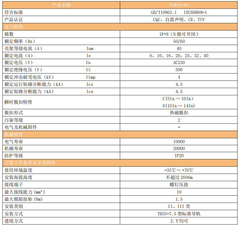 TGB1N-40 小型断路器(以下简称断路器)主要适用于研讨 50/60Hz,额定工作电压 230V,额定电流至 40A 的家用及类似场所的电力线路设施和电气设备进行过载和短路保护之用,亦可用于不频繁地通断操作。尤其适用于工业和商业的照明配电系统。